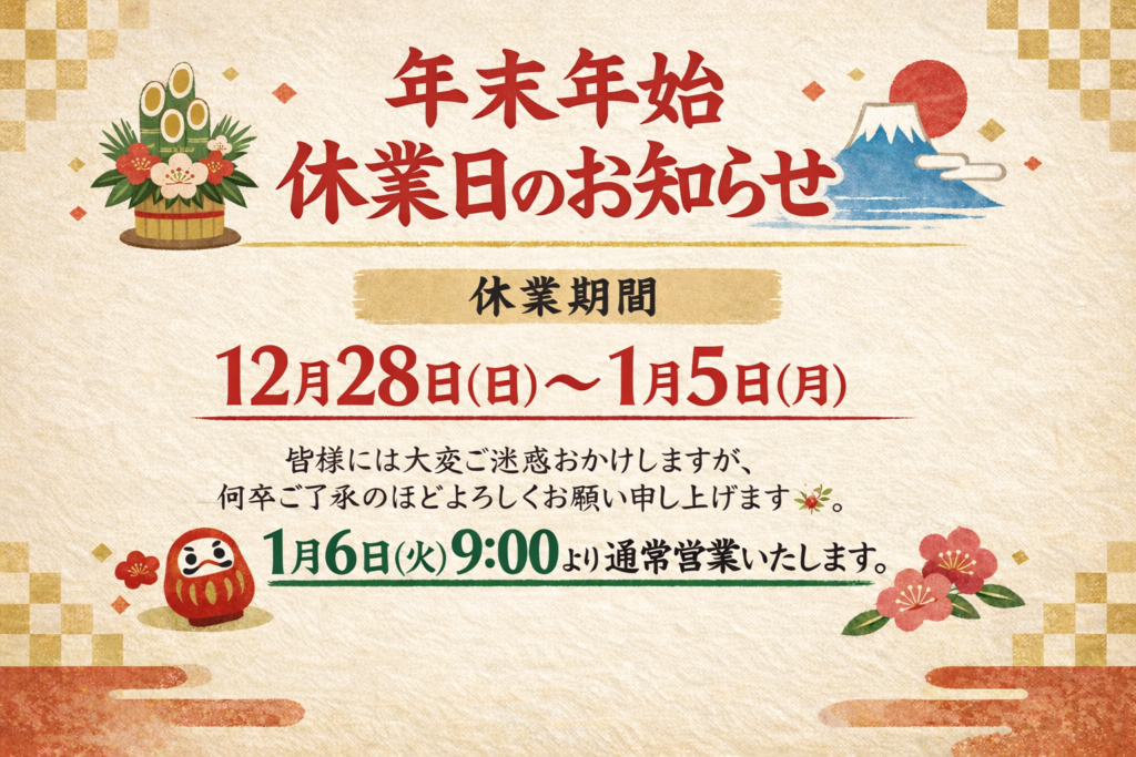 年末年始 休業日のお知らせ 2025.12.24 最終更新日時 : 2025.12.24 nagaoka 平素より、当店をご愛顧いただき誠にありがとうございます。 誠に勝手ながら、下記の日程で年末年始の休業日とさせていただきます。 12月28日(日)~1月5日(月) 1月6日(火)9時より通常営業いたします。 宜しくお願い致します。